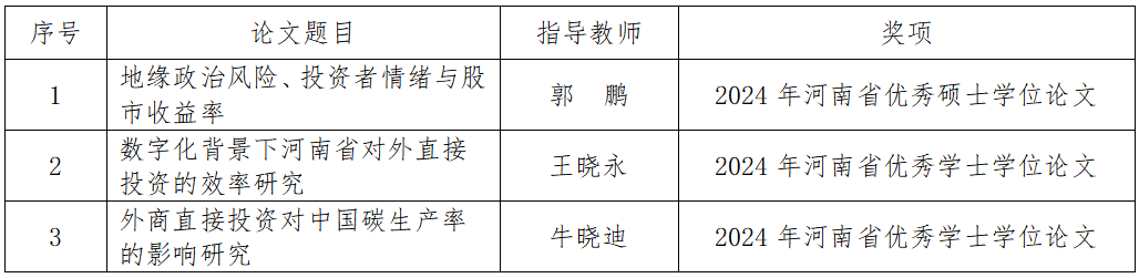 郭鹏老师指导的硕士学位论文《地缘政治风险、投资者情绪与股市收益率》荣获“河南省优秀硕士学位论文”;王晓永老师指导的学士学位论文《数字化背景下河南省对外直接投资的效率研究》和牛晓迪老师指导的学士学位论文《外商直接投资对中国碳生产率的影响研究》荣获“河南省优秀学士学位论文”。赌博网址